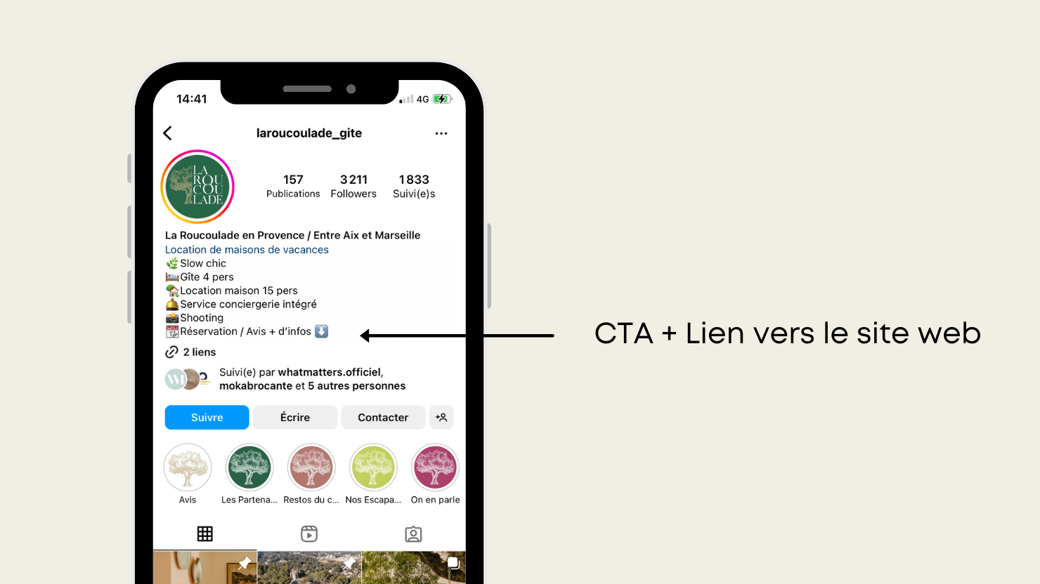 Instagram donne la possibilité aux comptes d’ajouter un lien (URL) vers un site web. Profitez-en pour ajouter le lien vers votre site web ou la page de réservation. Pensez également à la modifier lorsque cela est opportun. Si vous proposez par exemple un pack séjour ou une offre spéciale à un moment T, alors mettez à jour ce lien vers la page de redirection de l’offre.